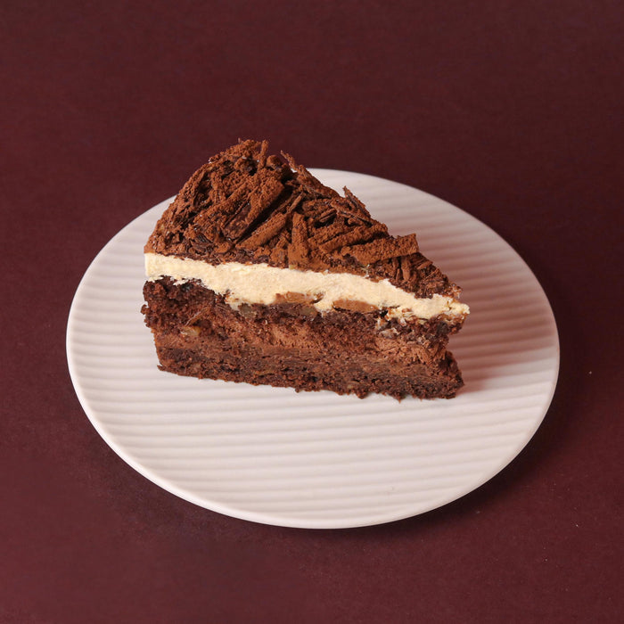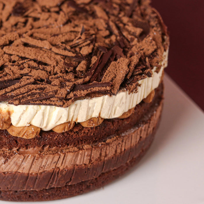 A rich and intense chocolate treat made with high quality couverture chocolate. Coffee infused brownie base layered with dark chocolate cream, white chocolate ganache cream, caramelised white chocolate and create a unique texture contrast by adding crunchy hazelnut feuilletine. Finish off with overloaded chocolate shavings and dusted cocoa powder.